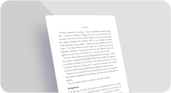 less compelling. For Brian, brands live in four places – culture, environment, products, and the mind – and give us a blueprint to design systems that connect those spaces. The orientation is around the customer and their experience, so we put systems designers and engineers alongside the storytellers. And we use the brand to connect architecture, history, culture, product – so that when we get a brief from Hershey’s to design a Times Square billboard, we instead give them a chocolate factory tourist destination. (Actually, we even generate revenue as our “billboard” became the highest grossing retail space in New York City – a real return on brand value). In surveys, clients consistently express disappointment about the degree to which their presence is fragmented. Mark Addicks, CMO of General Mills, has complained that marketers “are living in a world of chaos. They are desperate for order. They need a rulebook.” Marketers, no longer able to keep track of customers across myriad touch points, find it increasingly difficult to get a single view of their customers. The reason is that the digital world is intrinsically biased to the tactical, to ingenious small solutions, bubbling from the bottom up, but which do not really add up to anything. The cure is simple. Find your own Big Idea. Then milk it mercilessly. Telling Stories If 30 years ago you had asked someone what Beowulf (whom I have already mentioned once) had to do with advertising you would have got a funny look and not much of an answer. Since then it seems that everyone has become a storyteller. Just as ideas have become more important in the digital age, so, too, the power of storytelling has been re-discovered. It was always there, of course. But the internet puts the onus on the advertiser to attract users, and as advertising cannot rely solely on editorial content to bring them in, so it has become quite central. It is stories that attract. And our stories have to be as good as, or better than, their stories.