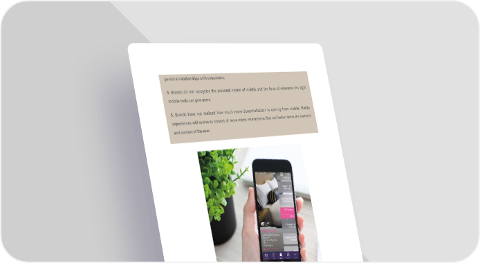personal relationships with consumers. 4. Brands do not recognize the personal nature of mobile and the level of relevance the right mobile tools can give users. 5. Brands have not realized how much more decentralization is coming from mobile. Mobile experiences will evolve to consist of more micro interactions that will better serve the moment and context of the user. Starwood Hotels took a different path, aggregating contextual data to improve travel. SPG Keyless is a mobile app that automatically checks you in and out of your hotel room, based on your booking time and geographical proximity. Bluetooth connectivity gives easy access to your room, as well as to elevators, pools and saunas. With push notifications to keep you up to date, guests can bypass check-in, check-out, and the front desk entirely! Most important of all, the app only works if customers sign up to the SPG loyalty programme, meaning a host of data is being collected to personalize