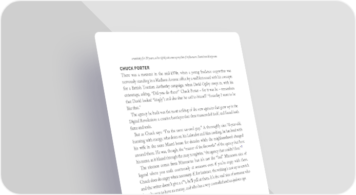 creativity for 20 years, so he rightly sits among my list of influencers. David would approve. CHUCK PORTER There was a moment in the mid-1970s, when a young freelance copywriter was nervously standing in a Madison Avenue office by a wall festooned with his concepts for a British Tourism Authority campaign, when David Ogilvy swept in, with his entourage, asking, “Did you do these?” Chuck Porter – for it was he – remembers that David looked “kingly”; and also that he said to himself: “Someday I want to be like that.” The agency he built was the most striking of the new agencies that grew up in the Digital Revolution: a creative boutique that then transcended itself, and found both fame and scale. But as Chuck says: “I’m the most un-cool guy.” A thoroughly nice 70-year-old, bursting with energy, who dotes on his Labrador and likes cooking, he has lived with his wife in the same Miami house for decades while the neighbourhood changed around them. He was, though, the “master of the fireworks” of the agency that bore 2 his name, as it blazed through the crazy noughties, “the agency that couldn’t lose.” The niceness comes from Minnesota: but it’s not the “bad” Minnesota nice of legend where you smile courteously at someone even if you’re angry with them. Chuck does do angry when necessary: if, for instance, the writing is not up to scratch and the writer doesn’t give a s**t, he’ll yell at them. It’s the real nice of someone who doesn’t seem to have an enemy, and who has a very controlled and un-jealous ego.
