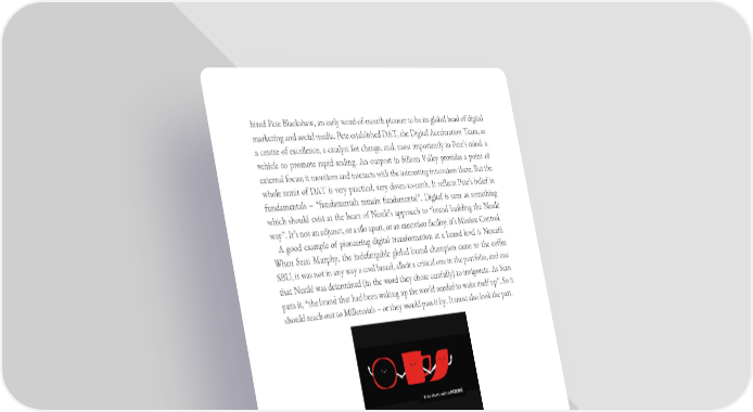 hired Pete Blackshaw, an early word-of-mouth pioneer to be its global head of digital marketing and social media. Pete established DAT, the Digital Acceleration Team, as a centre of excellence, a catalyst for change, and, most importantly in Pete’s mind, a vehicle to promote rapid scaling. An outpost in Silicon Valley provides a point of external focus; it monitors and interacts with the interesting innovators there. But the whole remit of DAT is very practical, very down-to-earth. It reflects Pete’s belief in fundamentals – “fundamentals remain fundamental”. Digital is seen as something which should exist at the heart of Nestlé’s approach to “brand building the Nestlé way”. It’s not an adjunct, or a silo apart, or an execution facility: it’s Mission Control. A good example of pioneering digital transformation at a brand level is Nescafé. When Sean Murphy, the indefatigable global brand champion came to the coffee SBU, it was not in any way a cool brand, albeit a critical one in the portfolio, and one that Nestlé was determined (in the word they chose carefully) to invigorate. As Sean puts it, “the brand that had been waking up the world needed to wake itself up”. So it should reach out to Millennials – or they would pass it by. It must also look the part.