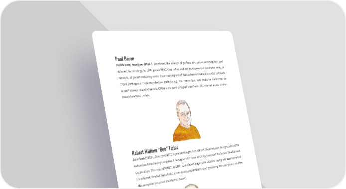 Paul Baran Polish-born American (1926-). Developed the concept of packets and packet-switching, but used different terminology. In 1960, joined RAND Corporation and led development of distributed array, or network, of packet-switching nodes. Later work expanded distributed communications idea to include OFDM (orthogonal frequency-division multiplexing), the notion that data could be transferred via several closely related channels. OFDM is the basis of digital broadband, DSL internet access, wireless networks and 4G mobile. Robert William “Bob” Taylor American (1932-). Director of IPTO in years leading to first ARPANET transmission. Recognized need for networked timesharing computer at Pentagon with those at UC-Berkeley and the System Development Corporation. This was ARPANET. In 1968, co-authored paper with Licklider laying out development of the internet. Headed Xerox PARC, which developed WYSIWYG word processing, the laser printer, and the Alto computer (on which the Mac was based).
