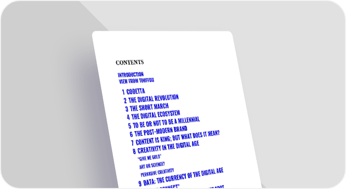 CONTENTS INTRODUCTION VIEW FROM TOUFFOU 1 CODETTA 2 THE DIGITAL REVOLUTION 3 THE SHORT MARCH 4 THE DIGITAL ECOSYSTEM 5 TO BE OR NOT TO BE A MILLENNIAL 6 THE POST-MODERN BRAND 7 CONTENT IS KING; BUT WHAT DOES IT MEAN? 8 CREATIVITY IN THE DIGITAL AGE “GIVE ME GOLD” ART OR SCIENCE? PERVASIVE CREATIVITY 9 DATA: THE CURRENCY OF THE DIGITAL AGE 10 “ONLY CONNECT” 11 CREATIVE TECHNOLOGY: THE SWEET SPOT 12 THE THREE BATTLEGROUNDS PUTTING THE SOCIAL BACK INTO SOCIAL MEDIA THE JOY OF MOBILITY CONTINUOUS COMMERCE 13 DIGITAL TRANSFORMATIONS DIGITAL POLITICS